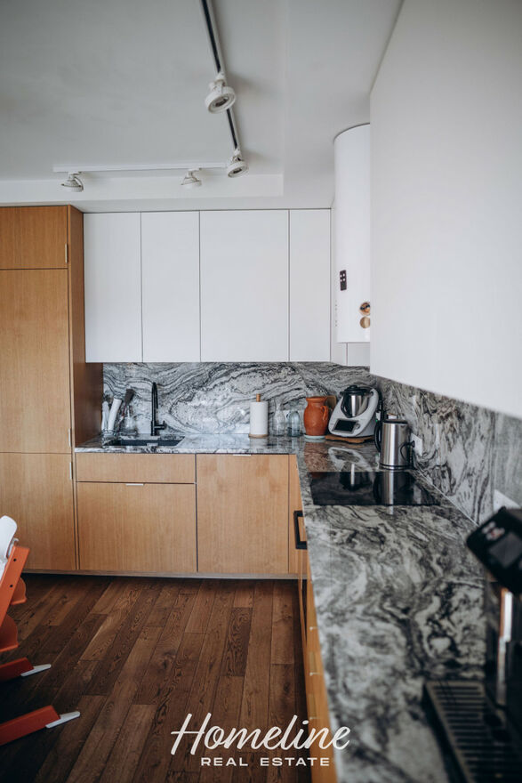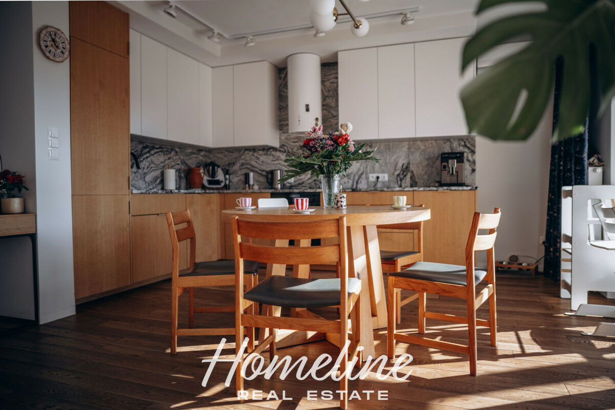 - drewniane podłogi, indywidualnie zaprojektowana kuchnia z frontami drewnianymi i kamiennymi blatami, wysokiej klasy sprzęt AGD,