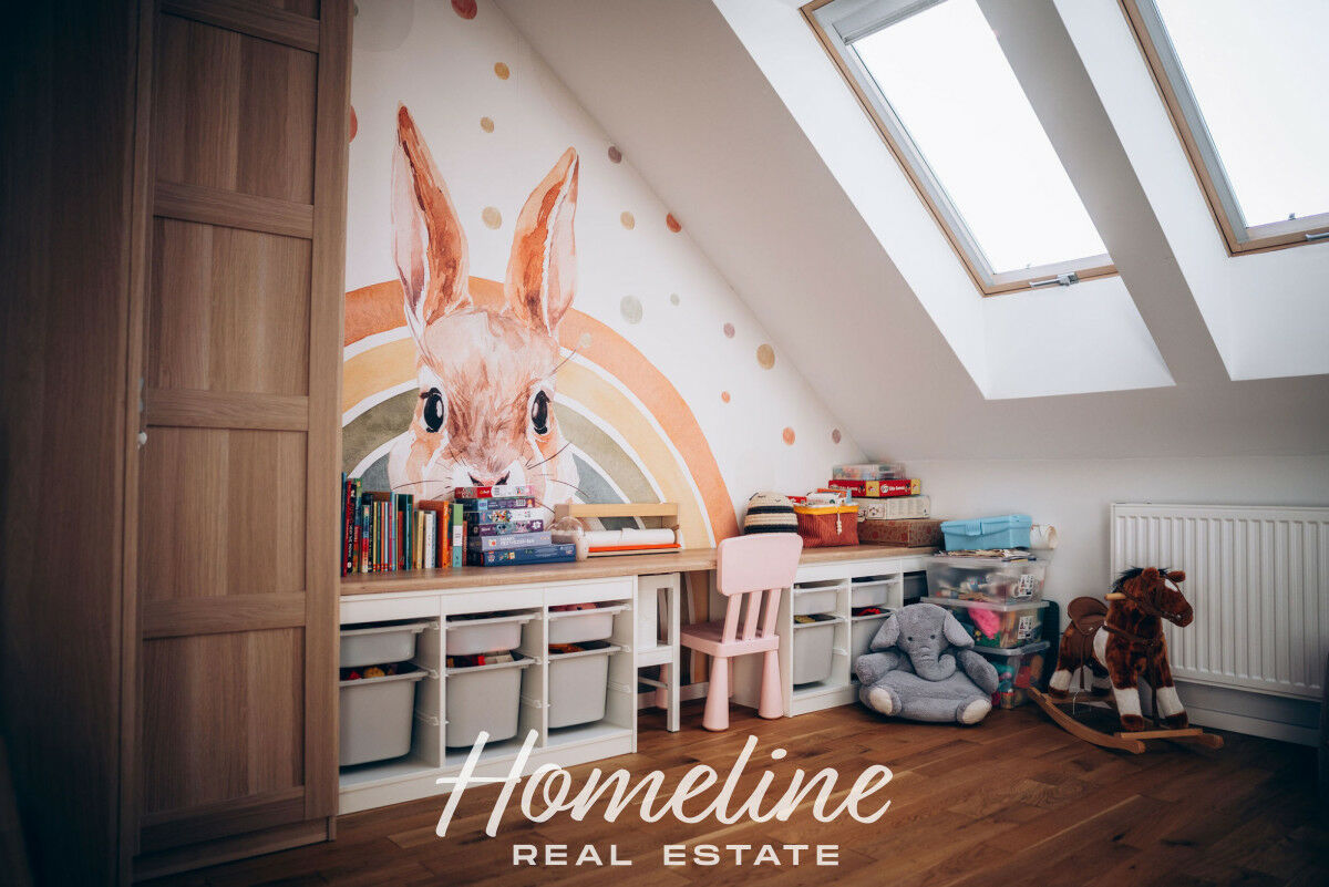 Piętro: główna sypialnia, dwa pokoje dziecięce, komfortowa łazienka z wanną.